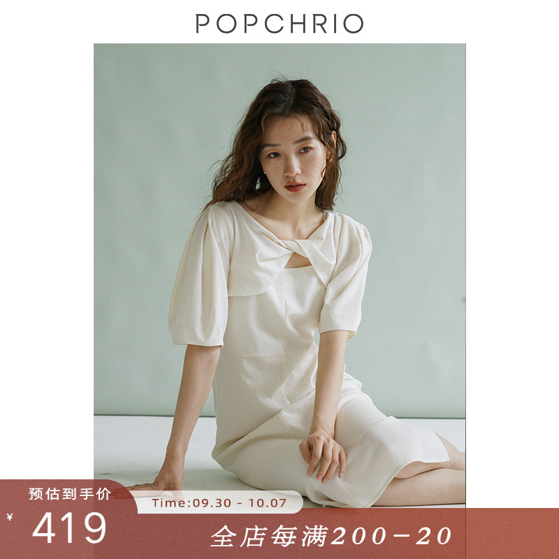 女装/女士精品^连衣裙^^^江苏 常州^POPCHRIO欧可芮◆设计感扭结圆领小飞短袖连衣裙黑色修身a字裙女