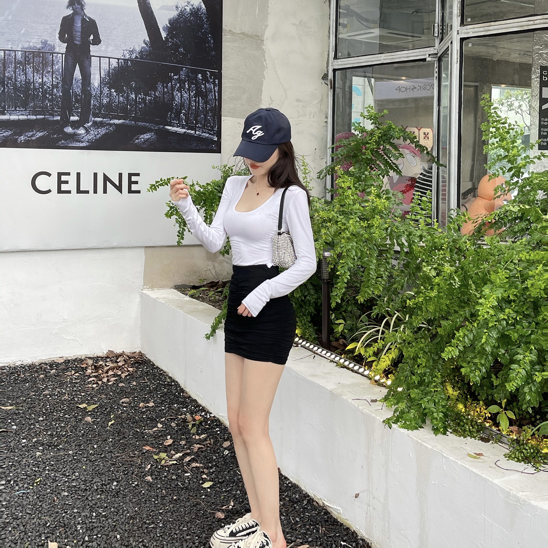 脸红少女 设计感下摆弧形修身性感显瘦打底白t恤女辣妹长袖打底衫热门设计联盟服务商