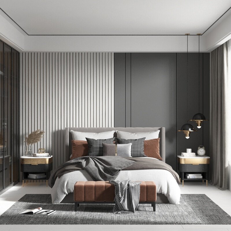 。现代硬包轻奢卧室背景墙床头半圆柱客厅沙发电视软包影视墙金属热门设计联盟服务商